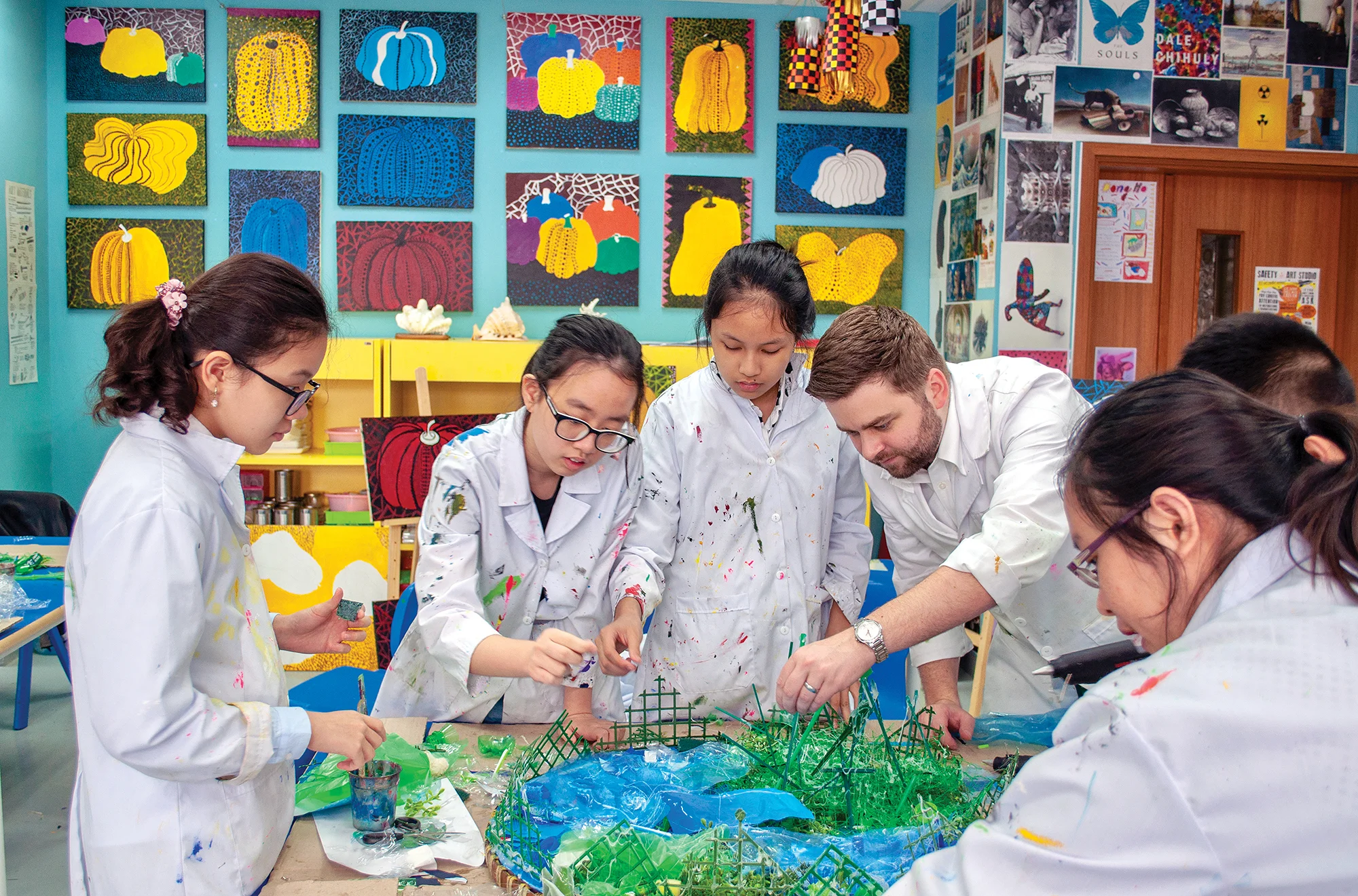 Year 6 and 7 students learned about the environmental consequences of the proliferation of plastics as they worked to depict the globe covered in plastic. Using trays from the local markets as their substrate, they collaged blue and green pieces of plastic waste in the shapes of the world's oceans and landmasses, creating views of our planet that illustrate the global scale of plastic pollution.